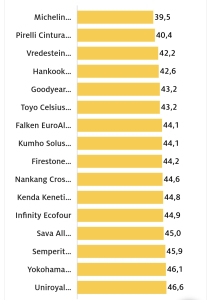 Резултатите показват значителни разлики в представянето на моделите. Michelin CrossClimate 2 се представя най-добре при спиране на сух път, като спирачният й път е 39.5 метра. На второ място е Pirelli Cinturato All Season SF2 с 40.4 метра. От друга страна, моделите като UNIROYAL AllSeasonExpert 2 и Yokohama BluEarth-4S имат най-дългите спирачни пътища, което може да бъде критично при аварийни ситуации.